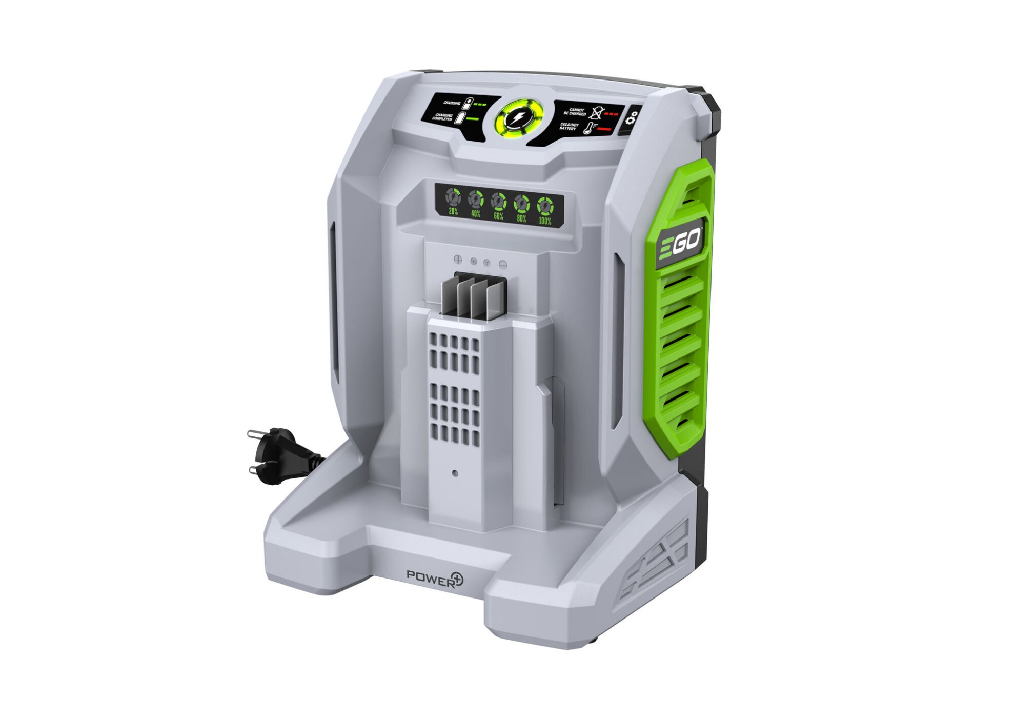 Pro rychlé nabíjení baterií EGO je nutné použít inteligentní rychlonabíječky EGO. Rychlonabíječka je opatřena ložem baterie tak, aby se baterie dostala do nabíječky pouze správným způsobem. Nabíječka je opatřena řídící elektronikou, která naprosto samostatně vyhodnotí stav baterie a automaticky zvolí režim nabíjení, dobu nabíjení a nabíjecí proud. Stav baterie a aktuální stav nabití je indikován LED diodami na panelu. Nabíječka je tak plně automatická bez jakéhokoliv nutného zásahu ze strany uživatele. Ergonomicky je navržena tak, aby byla dostatečně stabilní nebo ji lze zavesit na zeď. Díky účinnému ventilátoru je chlazení baterie efektivnější a umožňuje zahájit nabíjení baterie dříve a dokončit nabíjení rychleji. Výsledkem je, že čas potřebný k nabití baterie je často kratší než pracovní doba plně nabitého stroje. Například od "0" do plného nabití 2,5Ah baterie trvá této nabíječce méně než 30 minut a baterie 5,0Ah 30 minut. Takže při střídání dvou baterií mnohdy pokryjete výkon potřebný pro celodenní práci. Přes Bluetooth rozhraní je možnost připojení na dálku pomocí EGO Connect aplikace, což umožňuje uživateli nejenom sledovat průběh nabíjení, ale také hlídat aktuální stav baterie tak, aby byla včas připravena k práci.
