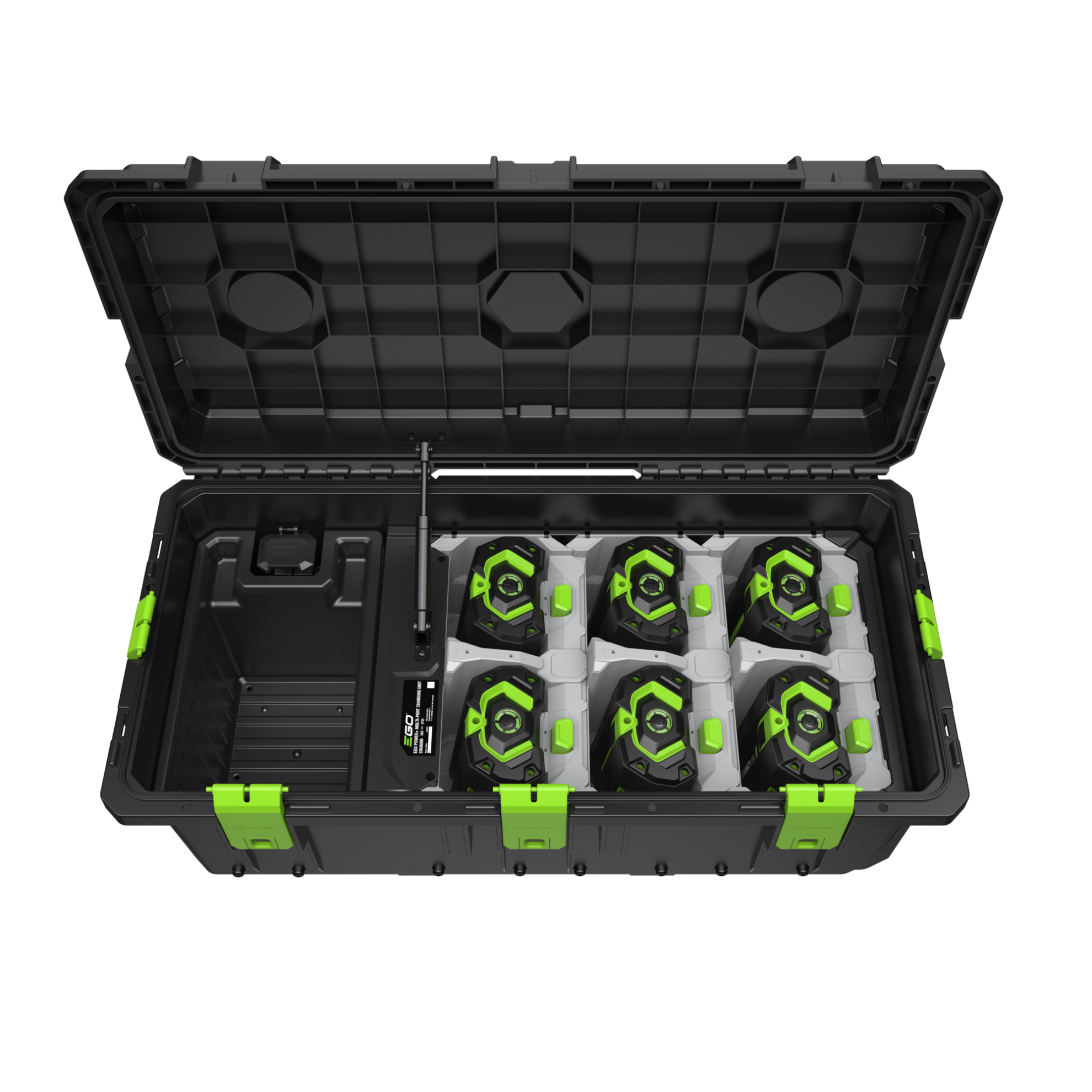Profesionální, šestimístný nabíjecí box EGO v sadě se supernabíječkou EGO CHV1600E o výkonu 1600W nabije až 6 přenosných baterií EGO 10Ah současně za 3 hodiny - ideální pro profesionální uživatele.