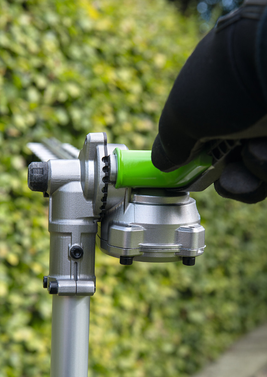Dlouhá verze nástavce na živé ploty je ideální pro tvarování vysokých a dlouhých živých plotů a větví a je opatřen lištou 51cm. Oboustranná lišta je naprosto přesně vyříznuta laserem a je opatřena dvěma noži s oboustranně, diamantem broušenými břity. Je tak docíleno mimořádně precizního, čistého a přesného střihu. Úhel sklonu lišty je nastavitelný do 12 poloh tak, aby se přizpůsobil příslušné práci na konkrétním porostu a usnadnil také uskladnění v malých prostorách. Je určen hlavně pro zarovnávání a zastřihování živých plotů vyšších výšek, kam nezle dosáhnout jednoúčelovými nůžkami na živý plot.