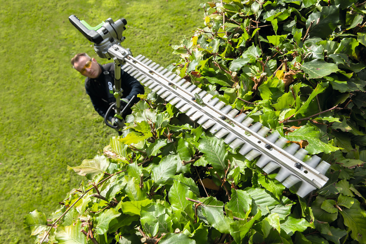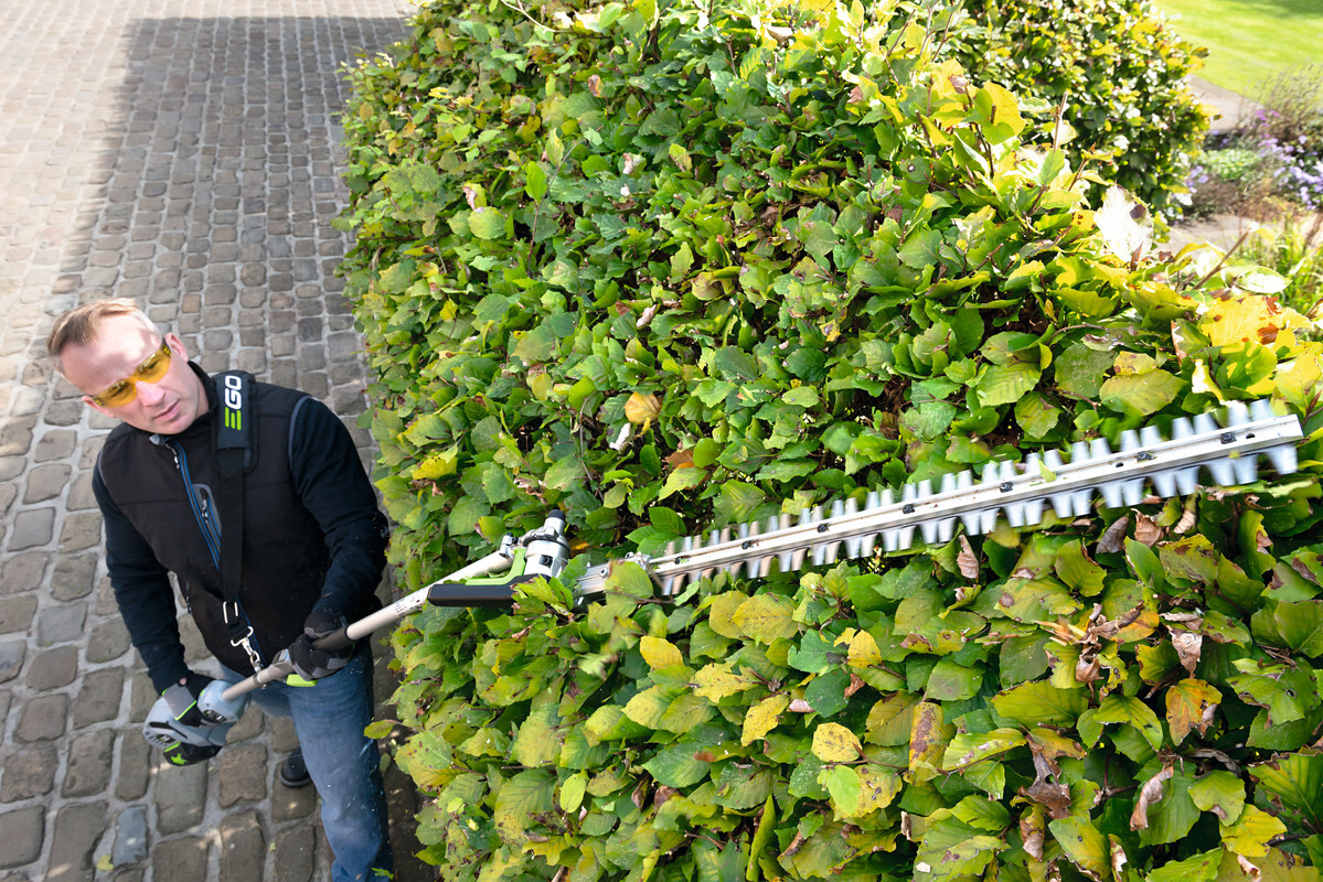 Pro kvalitní úpravu a precizní tvarování vysokých živých plotů a okrasných dřevin v okrasných zahradách, zámeckých parcích ale i doma na zahradě je důležitý čistý a přený střih, kterým rostlinu nepoškodíte, nezraníte a rostlina tak po zastřižení zůstává zdravá a svěží. To lze provádět v bezpečí stabilního postoje na pevné zemi. Proto je zde k dispozici nástavec s nůžkami na živý plot s dlouhým nástavcem a přesnou, 51 cm dlouhou oboustrannou lištou, přesně broušenou pomocí diamantového nástroje. Pohodlné manipululaci při práci přispívá rovněž otočný kloub lišty. Úhel sklonu lišty do 12 různých poloh je velmi důležitý, aby se přizpůsobil příslušné práci na konkrétním porostu a usnadnil také uskladnění v malých prostorách. Mimořádně ostré střižné zuby mají rozteč 26 mm jsou schopny ustřihnout dřevinu do průměru až 15 mm. Celková délka nástavce je 160 cm, ve složeném stavu 99 cm. Pohonná jednotka v kombinaci s tímto nástavcem je plnohodnotnými nůžkami na živé ploty s mimořádně velkým dosahem. Celková délka nástroje včetně pohonné jednotky je 250 cm.