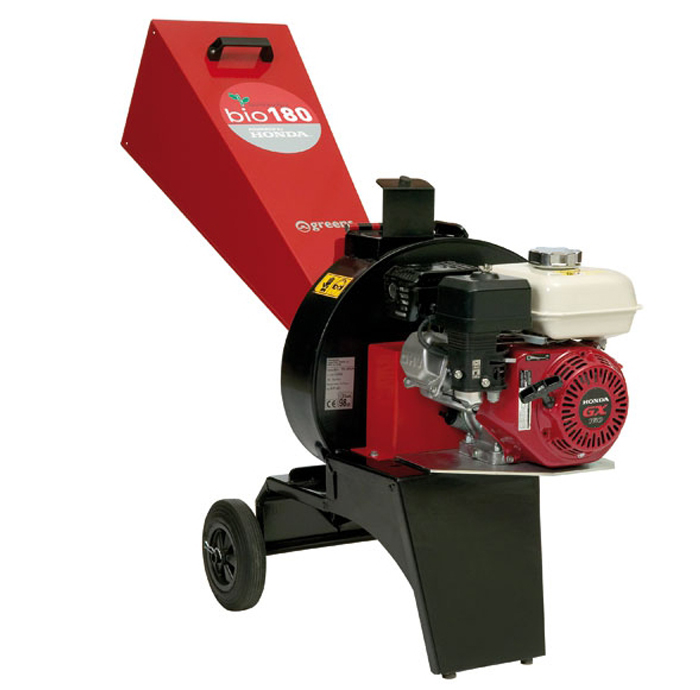 BIO 180: základní model motorových štěpkovačů BIO, poháněný silným a spolehlivým profesionálním motorem, vlastním manipulačním podvozkem a jednonožovým diskovým drtičem dřevěného odpadu.