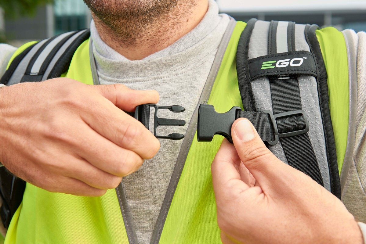 Je všeobecně známo, že čím větší baterie, tím větší výkon, delší pracovní doba, ale bohužel i větší hmotnost baterie. Na druhou stranu zase čím lehčí je stroj, tím komfortnější a snadnější je jeho obsluha. Např. baterie s kapacitou 10,0Ah váží 3,4kg a profesionální zádové velkokapacitní baterie 7,8kg, resp. 9,0kg. To je hmotnost, kterou již nelze dlouhodobě nosit v rukou. Proto existuje pohodlnější způsob maximálního využití energie i těchto největších baterií EGO Power+pomocí ergonomického profesionálního nosného zádového nosiče baterií a komfortního ergonomického postroje. Postroj je opatřen bohatým polstrováním ramenních popruhů i bederního pásu a možností nastavení popruhů optimálně pro konkrétní postavu uživatele. Pro případ možnosti zavěšení křovinořezu je nutné dokoupit závěs pro křovinořezy AHP1500.